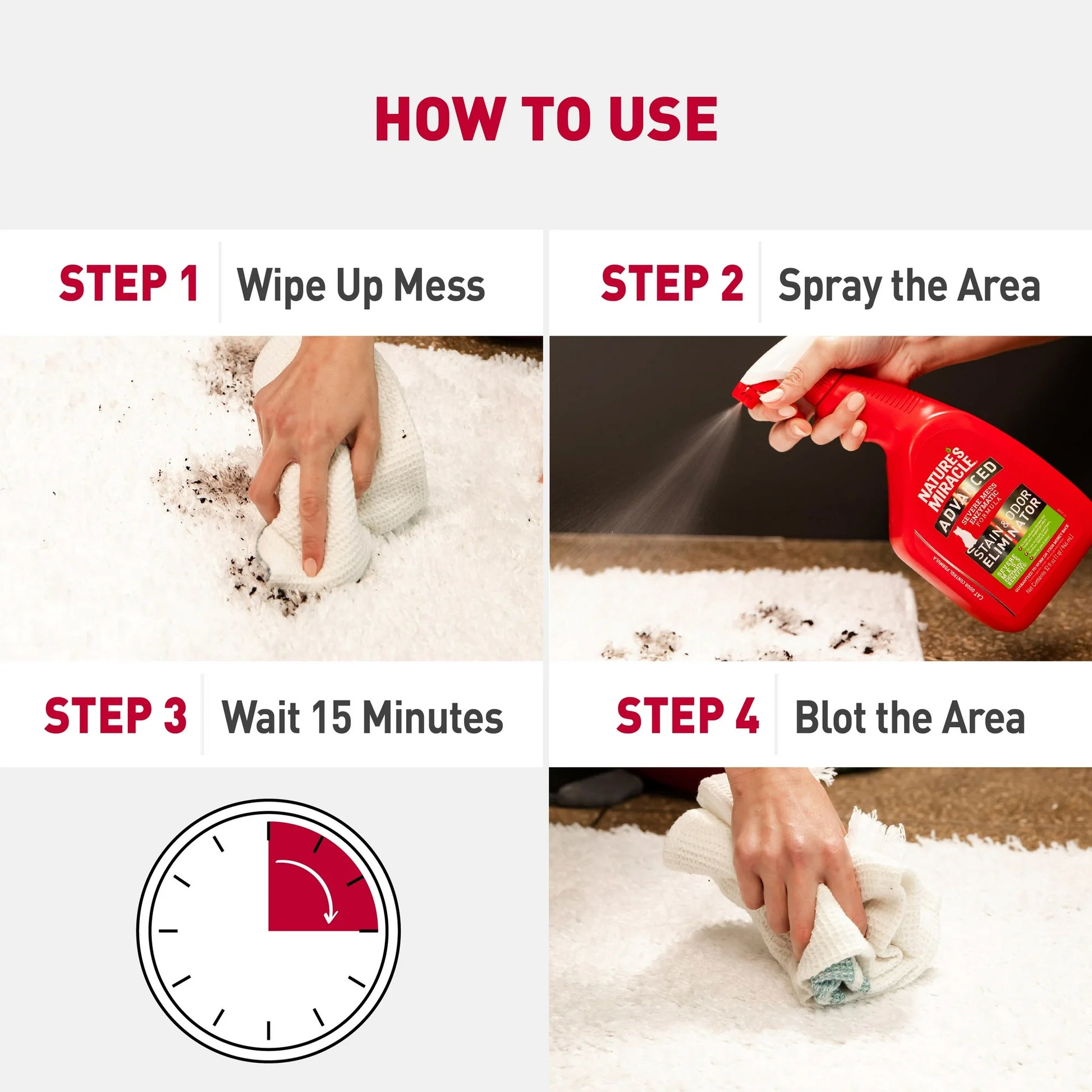 Nature's Miracle Advanced Stain and Odor Eliminator for cats is an enzymatic, severe-mess stain and Odor remover that actually discourages re-soiling by removing the Odor of even the toughest cat messes! Bacteria-based formulas produce enzymes when they come into contact with a food source - pet urine, faces, vomit and other bio-based messes. This enzymatic cleaner continues working as long as the food source is present. Freshens with a light fresh scent. Use on carpets, hard floors, furniture, fabrics and more (see the product label for a complete list of fabrics). Do not use on untreated hardwood, leather, suede, silk or wool specialty fabrics. Always use this product at full strength. Just spray, wait 10 minutes, then blot up stain with a white cloth. When used as directed, this product is safe to use around your pets and in your home. Always use Nature's Miracle products first. Other cleaners and detergents may fail, and chemically "set" stains that will be impossible to remove.